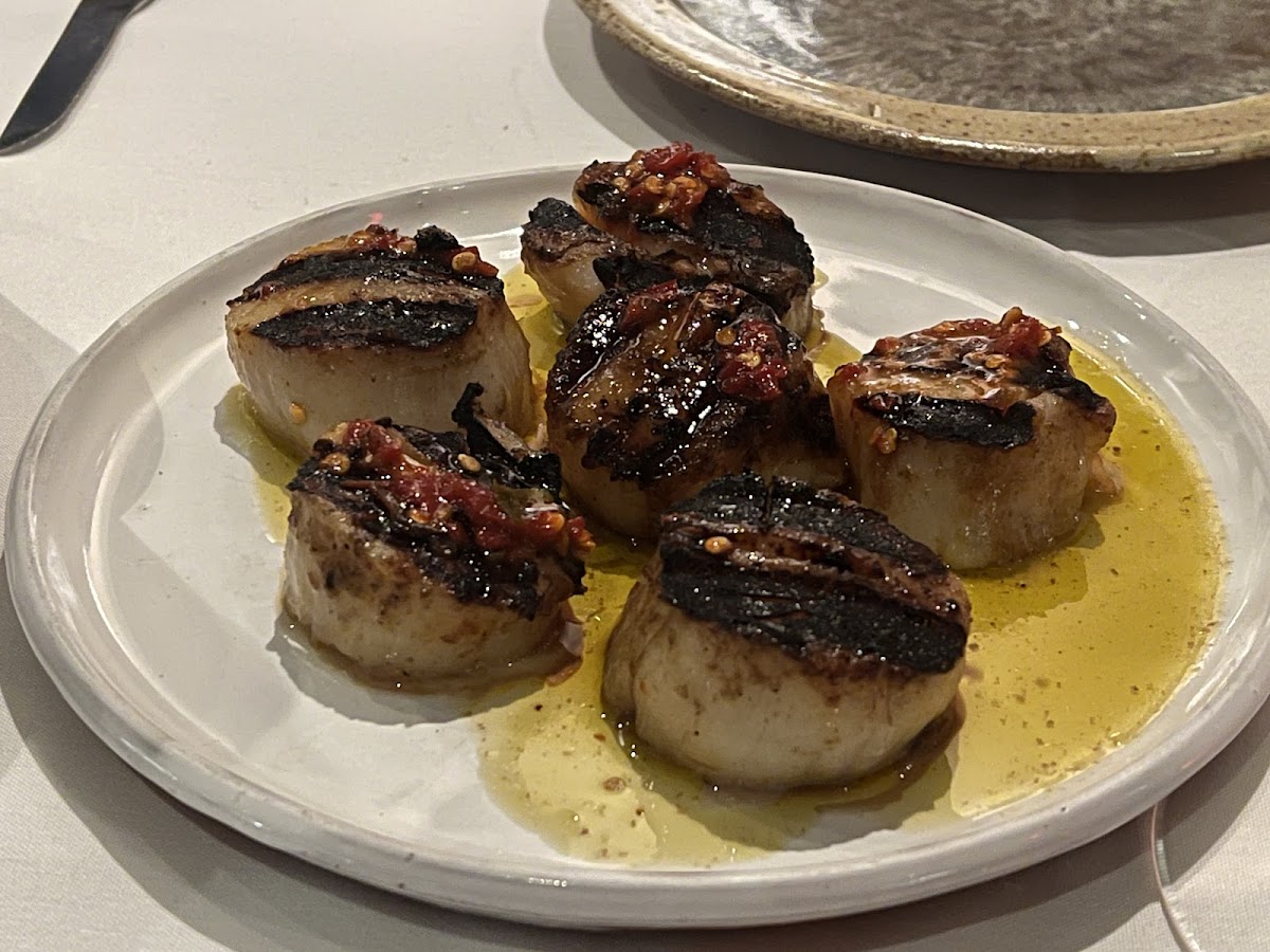 Grilled Scallops Sott'Olio with Pickled Cherry Bomb Peppers and Agretti